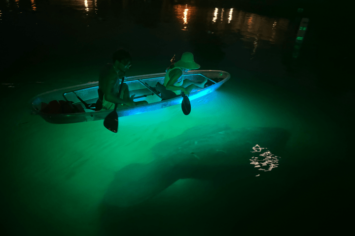 You will journey out to some of the clearest water in the world in our ALL clear kayaks with one of our amazing LOCAL guides. You will paddle to the outskirts of Three Sisters Springs as Three Sisters Springs is closed from November 15 – March 31st each year. We journey down the various crystal clear canal systems we have to offer in Crystal River. You will learn about our ecosystem and possibly spot local wildlife such as manatees, turtles, various birds, dolphins, and many species of fish. The Tour then leads out to our main bay “Kings Bay” where you will watch the Beautiful sunset of Crystal River. After this, you will be led to a different chain of Springs where you will turn on your lights and see the magnificent Clear Water Glowing through your ALL Clear Kayak. Manatee sightings are not guaranteed as they are wild animals, however, we take the best routes possible to find them. This is the NUMBER one tour in Florida for spring hunters. Don’t miss out and reserve your spot today!